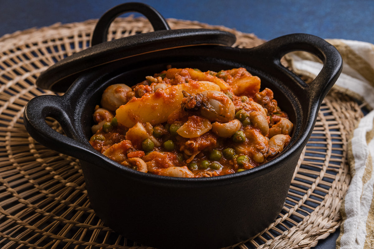 Soft cuttlefish cooked with sweet peas, tomatoes, and a splash of white wine. A traditional Italian seafood dish with fresh, mild flavors and a light, enjoyable texture.